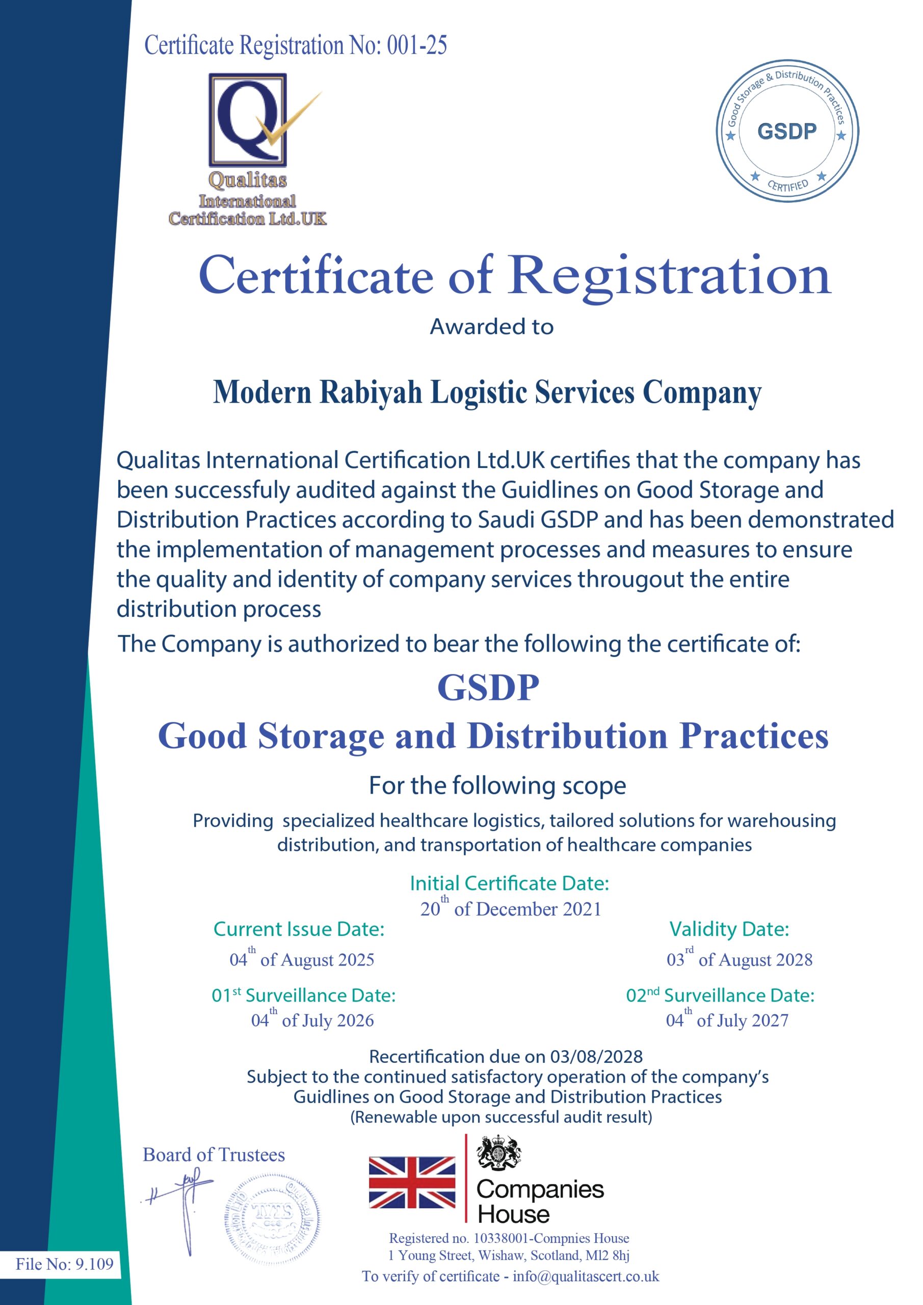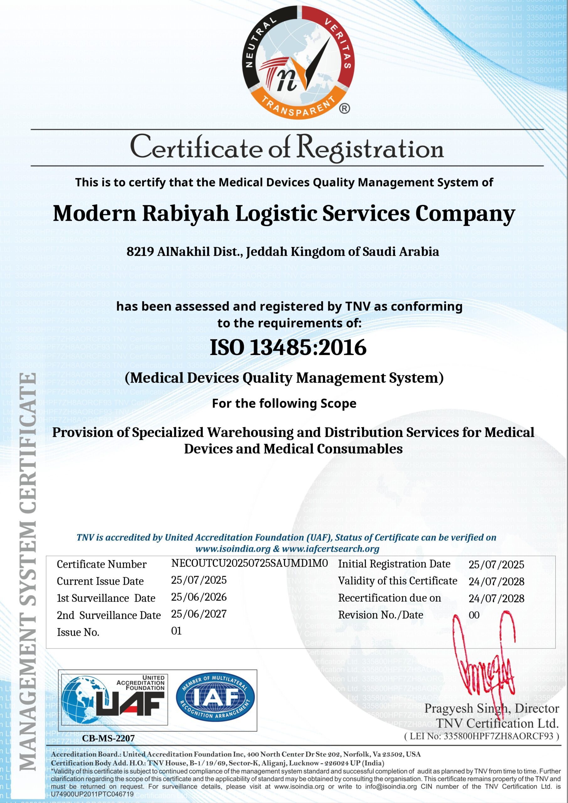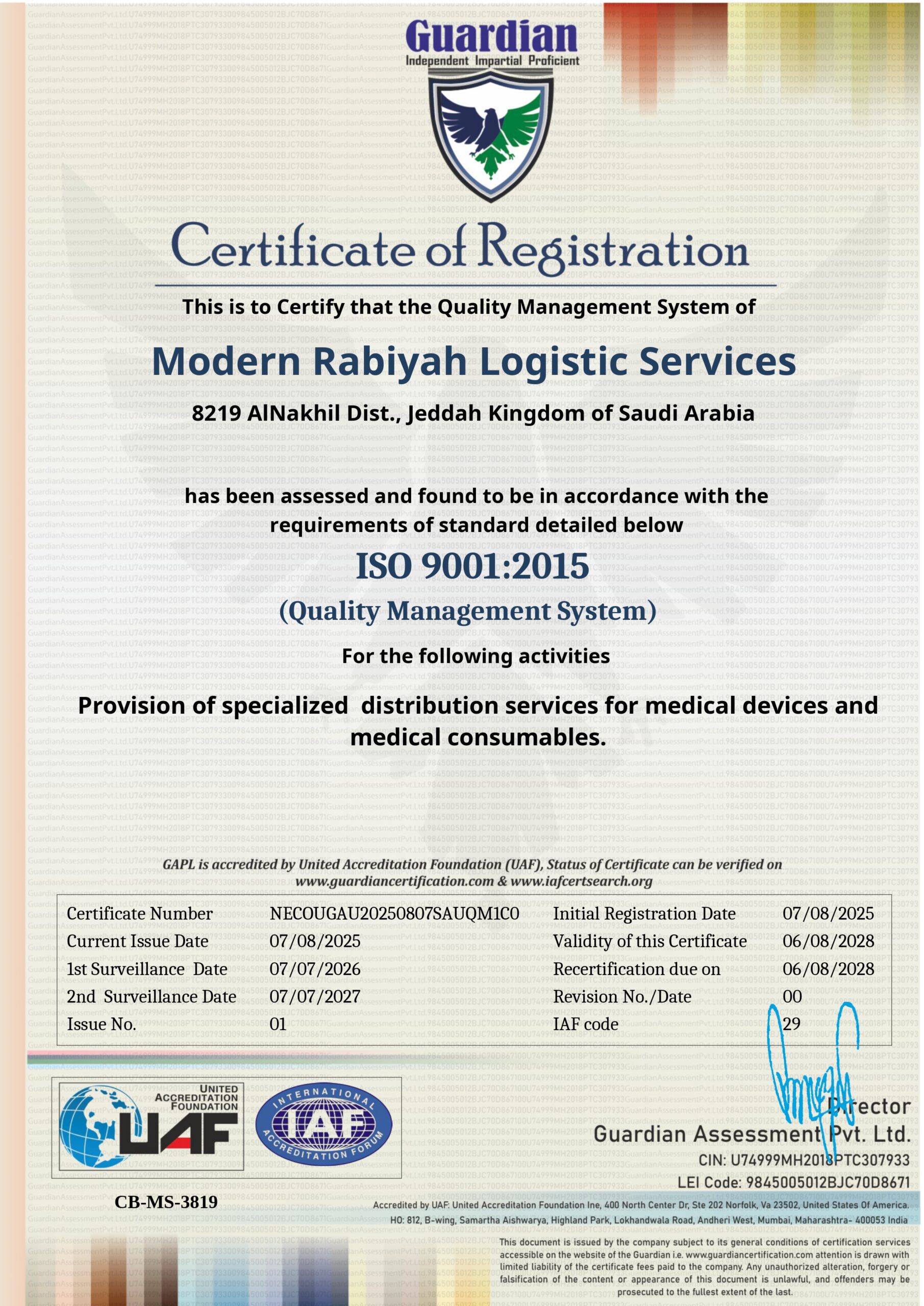 Meeting all requirements of the Quality Management System ISO 9001:2015, Medical Devices Quality Management System ISO 13485:2016, Good Storage and Distribution Practices (GSDP), and Occupational Health and Safety Management System ISO 45001:2018.