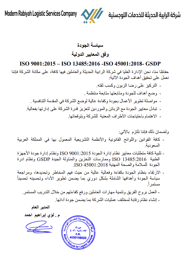 Quality Policy of Rabiyah Logistics Company In accordance with international standards: ISO 9001:2015 – ISO 13485:2016 –